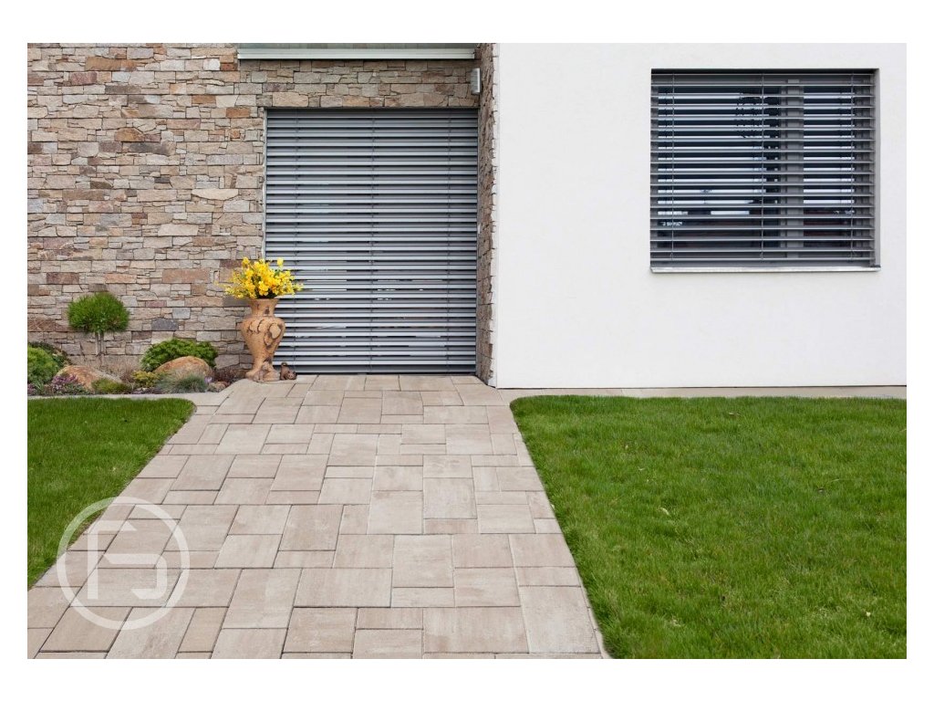 Dlažba Parko Kombi Latté bílo-karamelová - skladebná betonová dlažba o tloušťce 6 cm je určena k dláždění pochozích ploch jako jsou chodníky, cestičky v zahradách, terasy a také pro plochy s občasným provozem aut do 3,5 tuny, např. příjezdové cesty k rodinným domům a garážím, pěší zóny. Dlažba Parko Kombi je sestava tří kamenů s velmi malým nenápadným zkosením hran, kterému říkáme mikro fazeta. Takto zkosené hrany dodávají dlažbě luxusní vzhled.