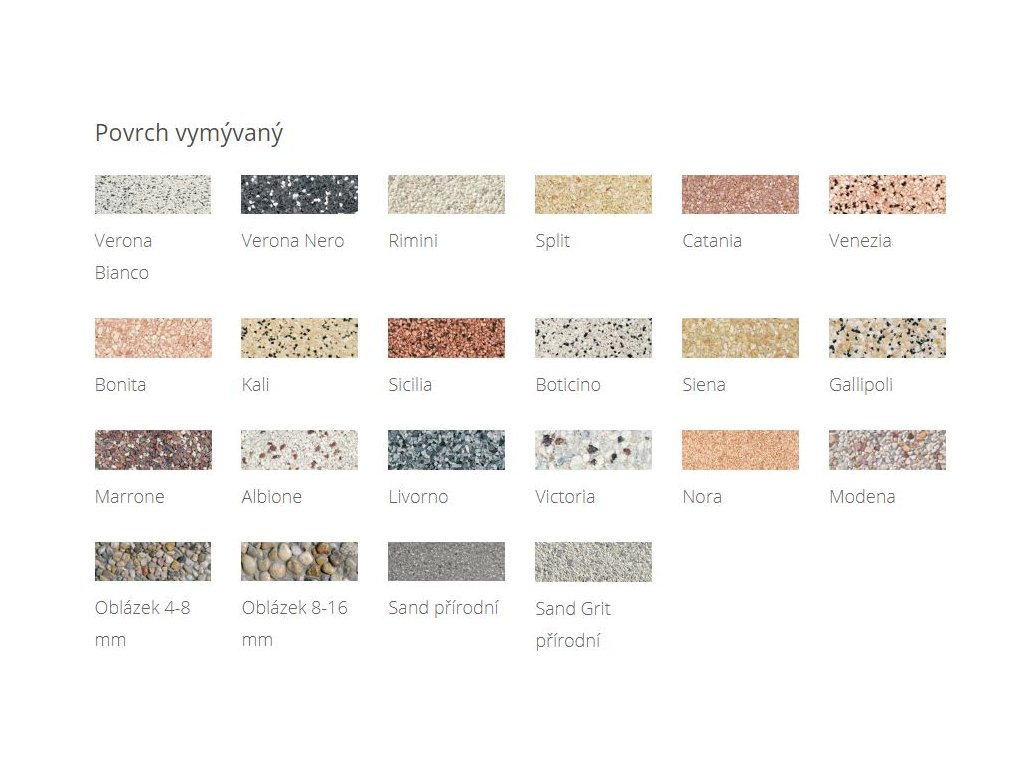 Barevnost: Verona Bianco, Verona Nero, Rimini, Victoria, Modena, Nora, Sicília, Gallipoli, Siena, Albione, Split, Kali, Bonita, Venezia, Marrone, Boticino, Livorno, Catania.